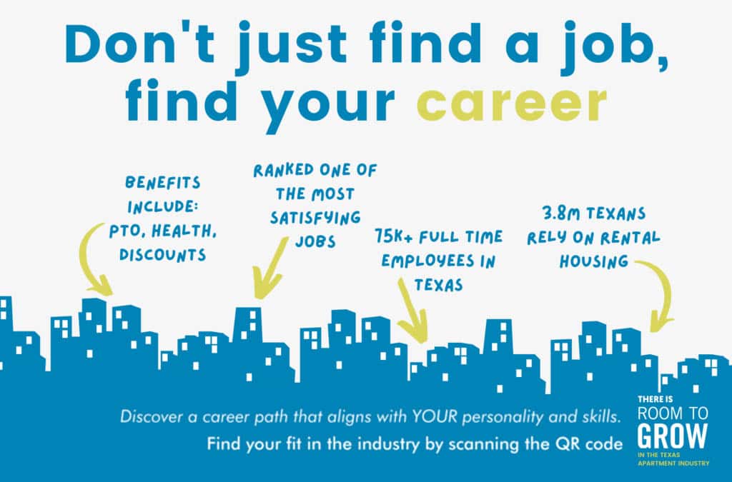 Multifamily—An industry that focuses on providing apartments and rental homes to the local population. By providing access to over 250,000 homes in Tarrant and eight other counties, the opportunities are boundless. Job types consist of apartment leasing, maintenance, administrative and accounting, training, management, and executive. Many resident-facing positions are attainable through training and advancement, even if you don’t have a college degree.